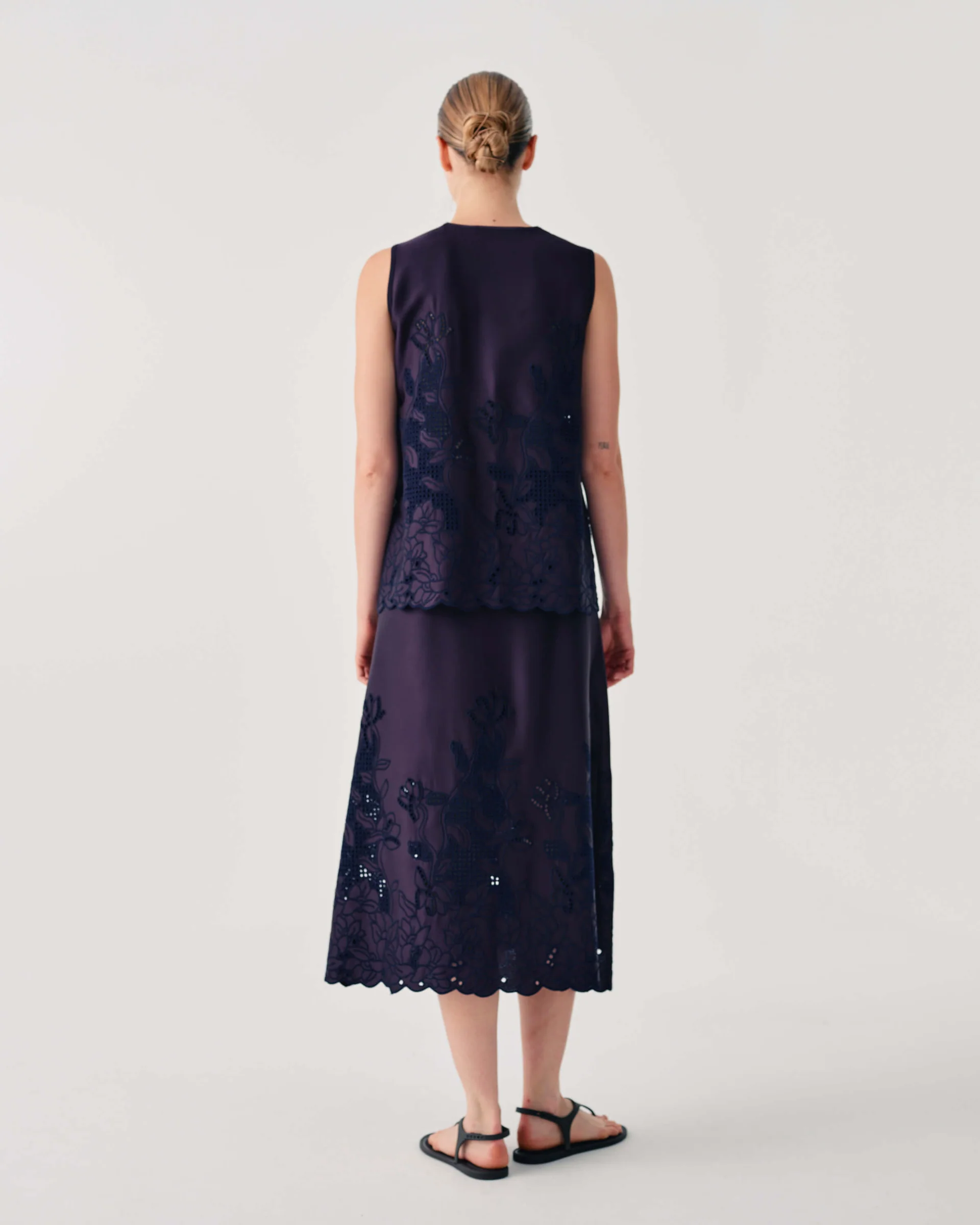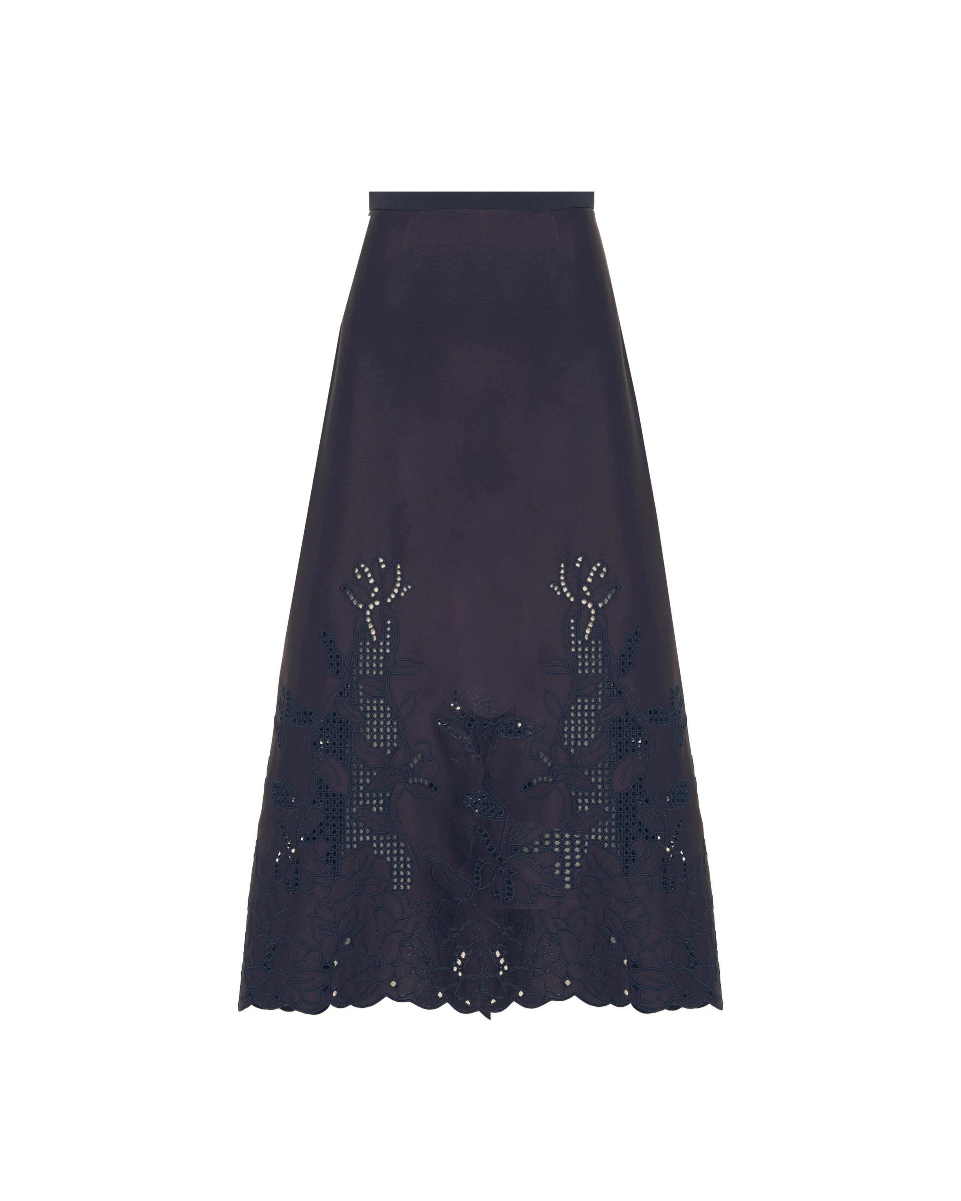 Midi skirt in structured fabric featuring floral cut-out embroidery. The flared silhouette enhances the figure, while the scalloped edge and tone-on-tone detailing add a refined and feminine touch. Navy.