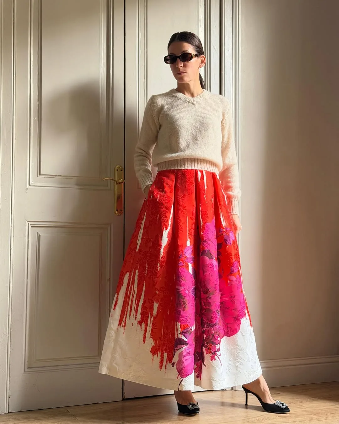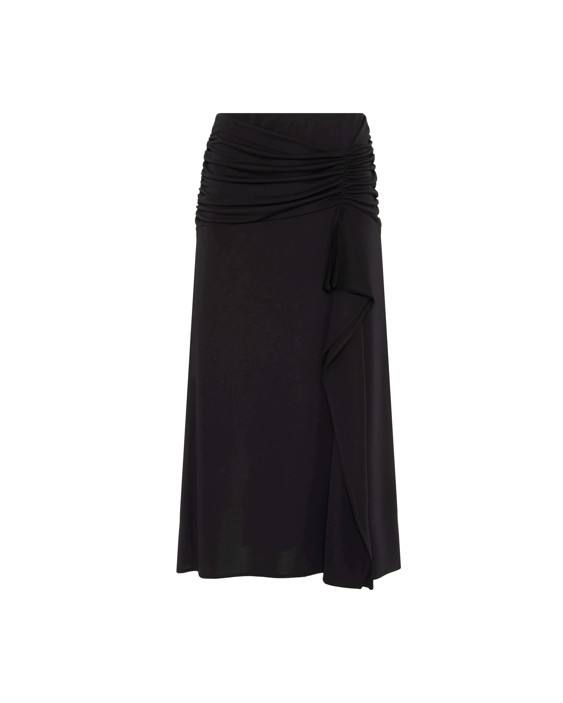 This skirt, made from fluid jersey, stands out for its feminine and sophisticated appeal. It features a midi length and is enhanced by a gathered yoke and a front ruffle. Made in Italy.