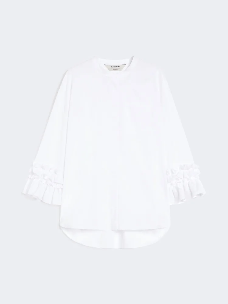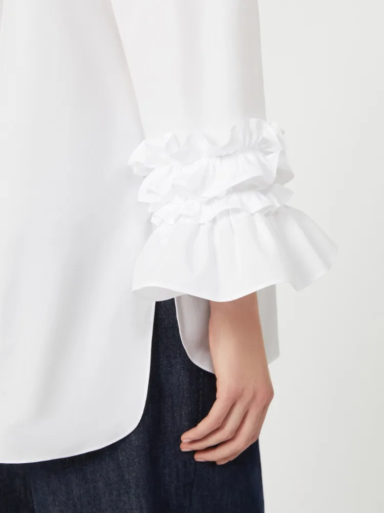 Flared shirt with fabric ruffles that trim the sleeve cuff.