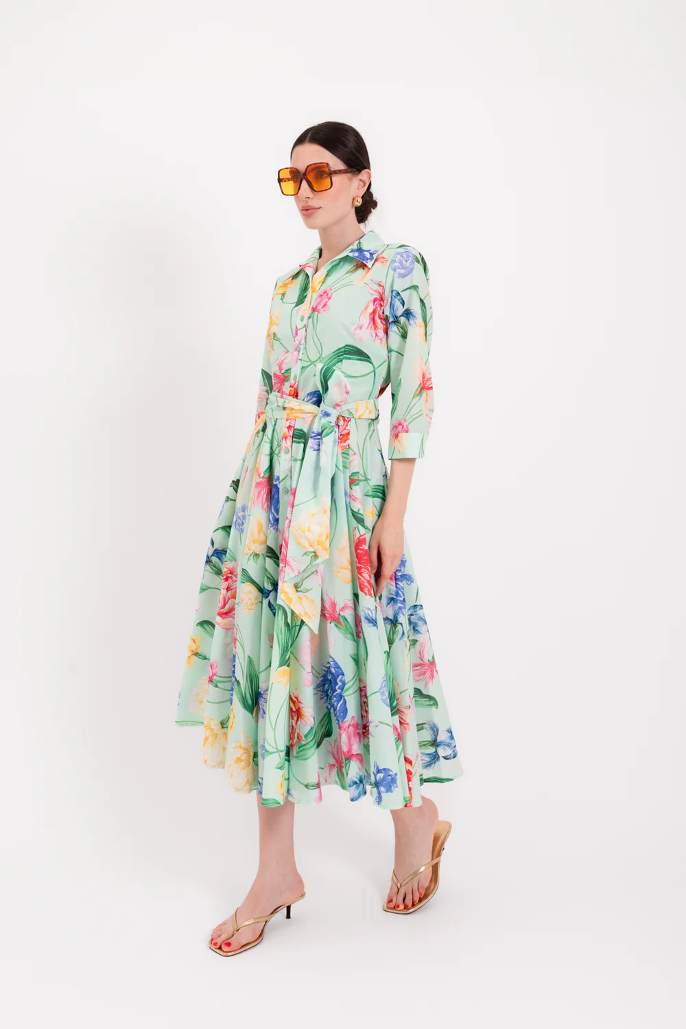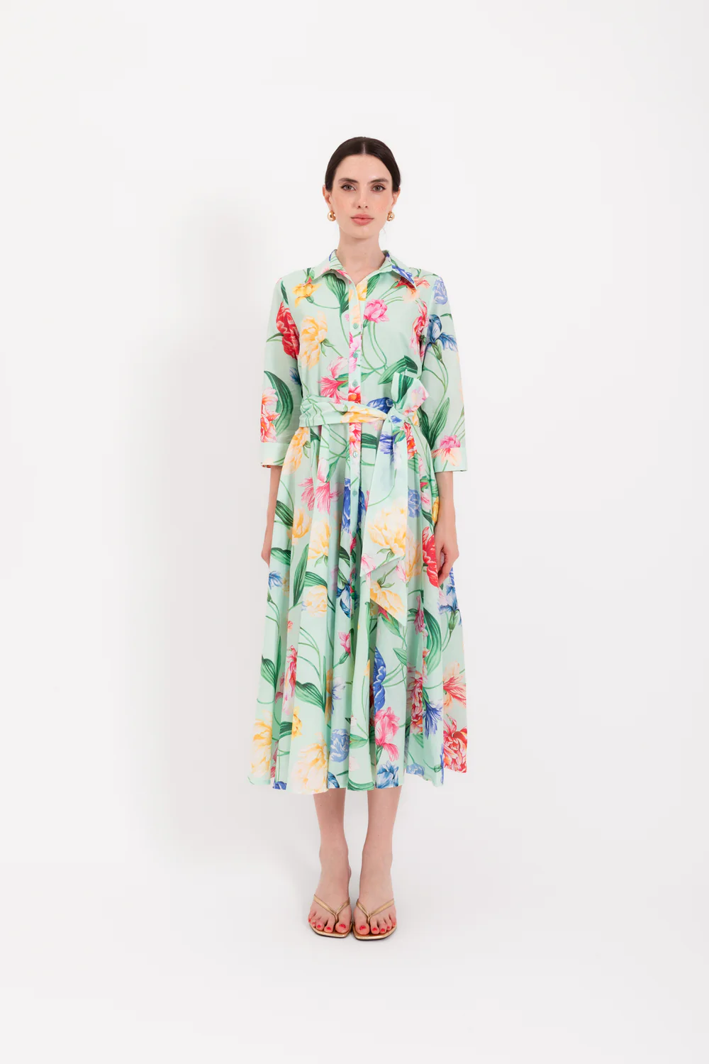 Spritz Midi Shirt Dress in light green by LAVI closes with a buttons, belt is included, two side pockets. Fabric 100% cotton. Made in Italy