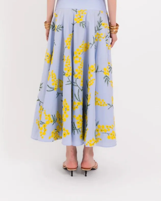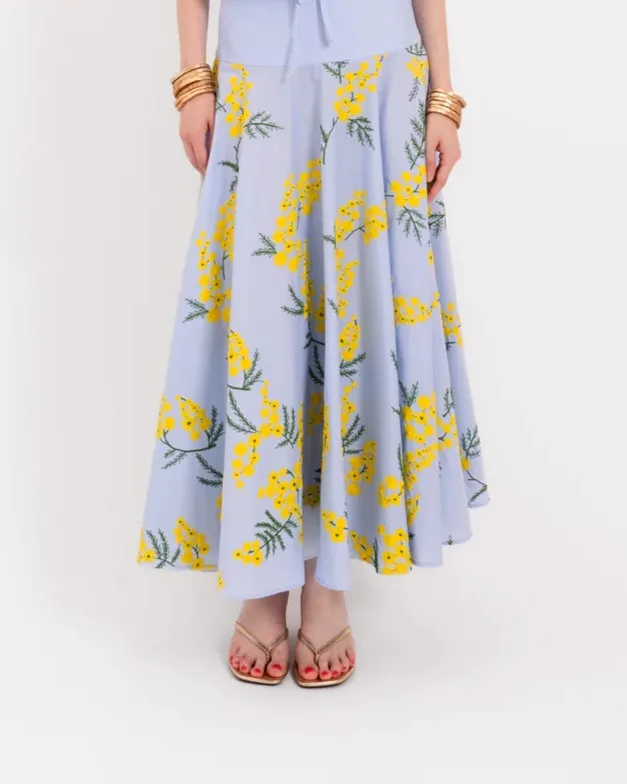 Petunia Midi Skirt in light blue by LAVI closes with a zip, two side pockets. Fabric 100% cotton. Made in Italy