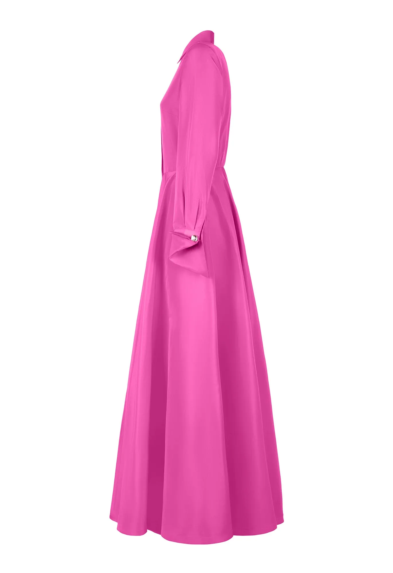 Mariasole Long Floor-length long sleeve circle skirt shirt dress with double cuffs in poly techno taffeta, color fuchsia